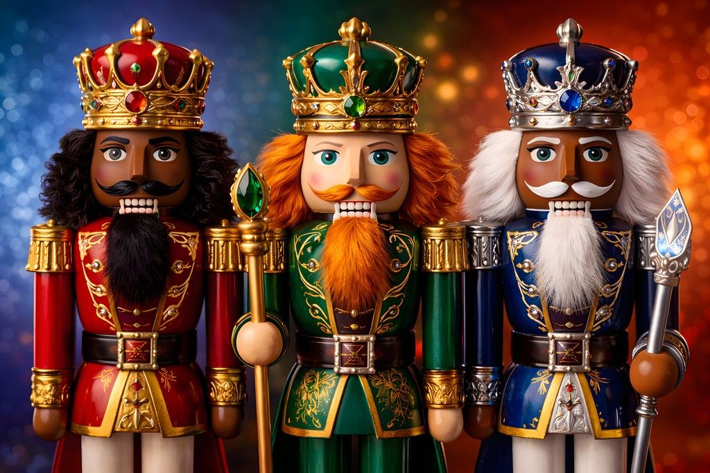 A colorful, close-up illustration of three ornate nutcracker king figures standing side by side. Each has a jeweled crown, a painted face with a prominent mustache and beard, and a richly decorated uniform with gold trim and engraved details. The figures wear distinct color themes—red, green, and blue—and hold ceremonial staffs or scepters with gem-like ornaments. The background is a softly blurred bokeh gradient with warm and cool tones, giving the scene a festive, holiday display feel.