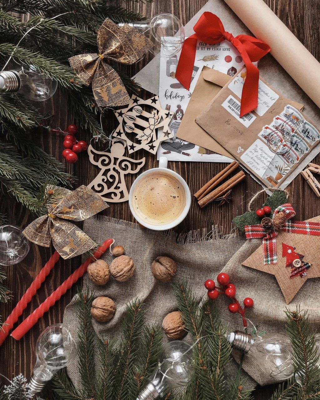 A warm, rustic holiday flat lay sits on a dark wooden table, framed by evergreen branches and scattered string-light bulbs. In the center is a cup of coffee with froth, surrounded by walnuts, cinnamon sticks, and red berry sprigs for a classic seasonal feel. Nearby are kraft-paper envelopes and a handwritten letter with postage stamps, plus festive paper and wooden decorations including an angel ornament, star shapes, and burlap bows. The color palette is mostly earthy browns and greens with bright red accents, creating a cozy, handcrafted Christmas atmosphere.