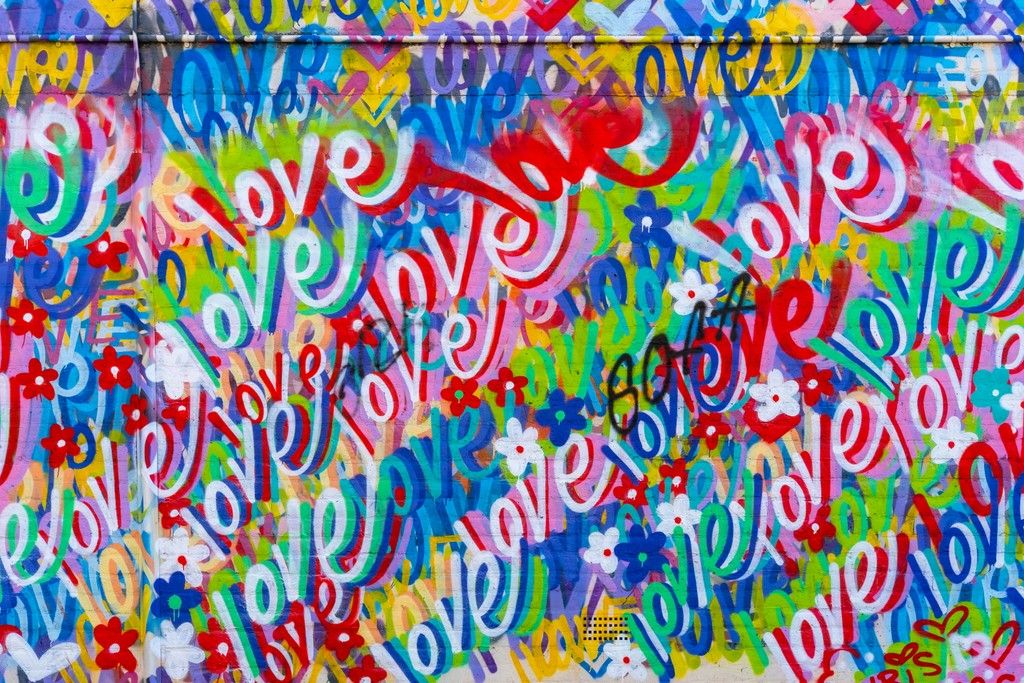 A vibrant street-art mural fills the frame with layered spray-paint lettering repeating the word "love" in large, looping script. Bold colors—reds, blues, greens, yellows, and purples—overlap in a dense, energetic pattern. Small flower shapes and heart motifs are scattered throughout the design, adding playful accents among the repeated text. The image reads like a close-up of an urban graffiti wall, with drips, overspray, and multiple paint layers creating a textured, lively look.
